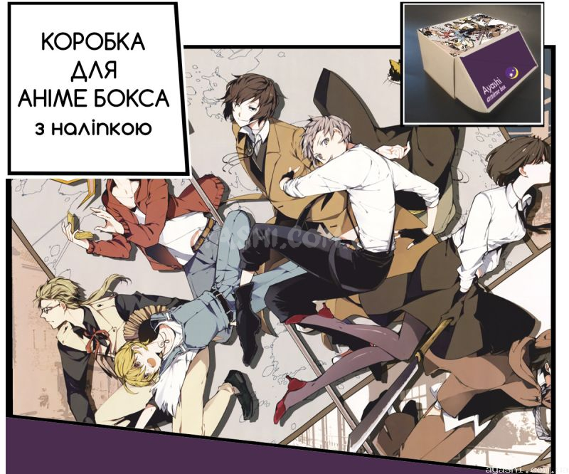 Сувенірна картонна коробка з наліпкою для формування аніме-боксу, дизайн зовнішньої частини виконано за мотивами Bungou Stray Dogs.