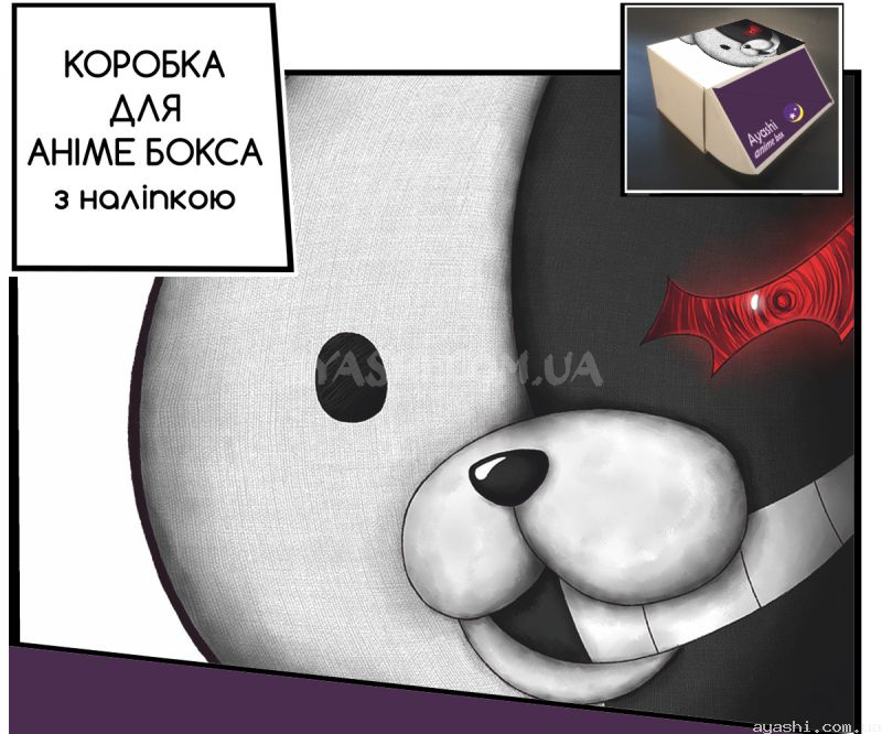 Сувенірна картонна коробка з наліпкою для формування аніме-боксу, дизайн зовнішньої частини виконано за мотивами Danganronpa.