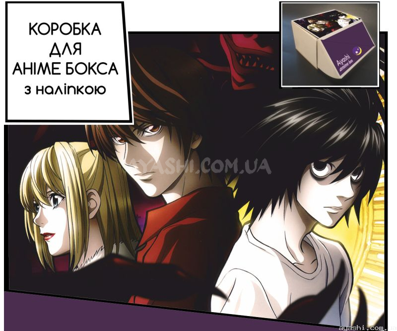 Сувенірна картонна коробка з наліпкою для формування аніме-боксу, дизайн зовнішньої частини виконано за мотивами Death Note.