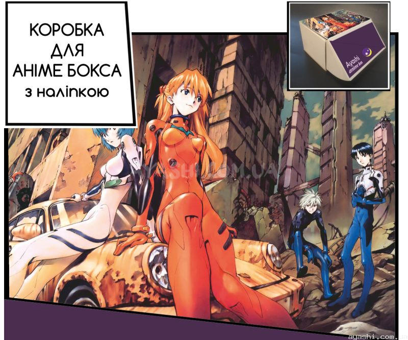 Сувенірна картонна коробка з наліпкою для формування аніме-боксу, дизайн зовнішньої частини виконано за мотивами Evangelion.