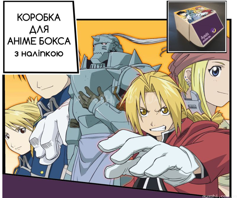 Сувенірна картонна коробка з наліпкою для формування аніме-боксу, дизайн зовнішньої частини виконано за мотивами Fullmetal Alchemist.