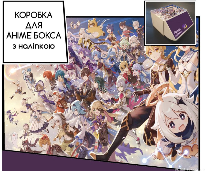 Сувенірна картонна коробка з наліпкою для формування аніме-боксу, дизайн зовнішньої частини виконано за мотивами Genshin Impact.