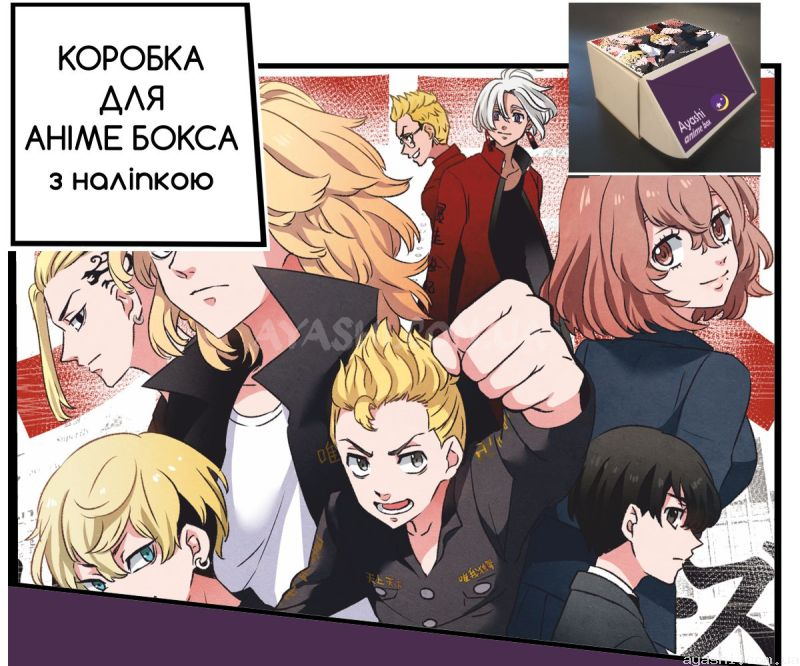 Сувенірна картонна коробка з наліпкою для формування аніме-боксу, дизайн зовнішньої частини виконано за мотивами Tokyo Revengers.